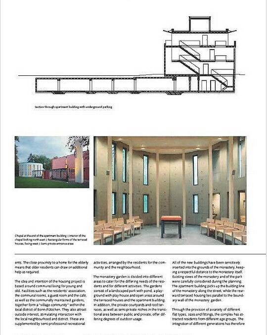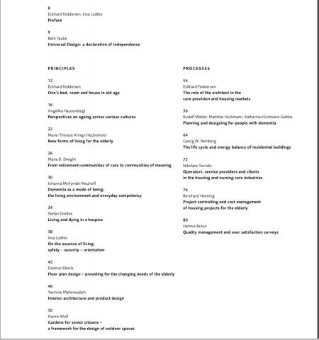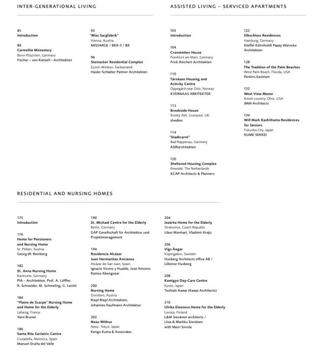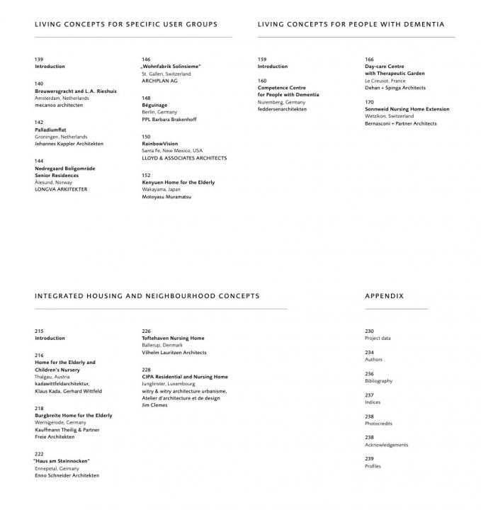Quality living in old age is one of the important topics of our time. Architects and builders can contribute innovative types of housing, intelligent concepts for barrier-free buildings, and advanced systems of care for people who are fragile or suffering from dementia. Intelligent design solutions can push back the limits on housing and care, on residential architecture and care facilities, on individual, collective, and assisted forms of housing, and even on the various phases of life in favor of a comprehensive trend toward integrated forms of housing.