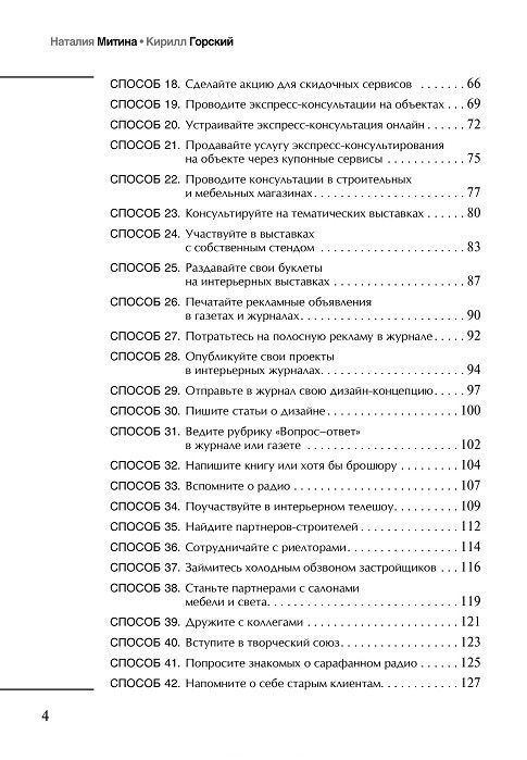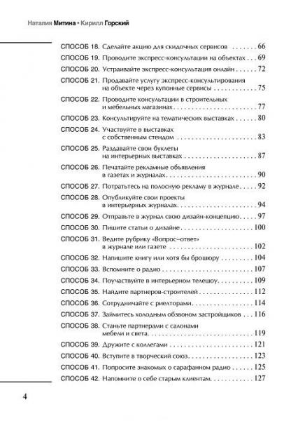 Привлечению клиентов не учат в российских школах интерьерного дизайна, но если раньше приходилось разыскивать советы, изучать подводные камни маркетинга по интернет-форумам и учиться скорее на своих ошибках, то теперь в этом больше нет необходимости. Наталия Митина, дизайнер интерьера и член правления Союза дизайнеров Латвии, автор бестселлера "Дизайн интерьера. Как открыть свое дело", и Кирилл Горский, глава команды профессионального интернет-форума дизайнеров интерьера Homeideas.ru, автор издания "Бизнес в дизайне интерьера", собрали в новой книге все известные им способы привлечения клиентов — все 57 и дали им подробное описание. Используйте любой и используйте все, и поток заказчиков вам гарантирован.