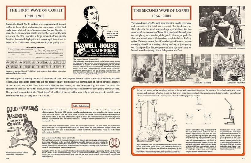 Going through a journey of more than a thousand year, coffee is destined to be not just a cup of beverage. This book gives a glimpse of coffee’s influence on customs, food, arts, philosophy, trade and finance through historical fragments. A thorough infographic of coffee timeline as well as the three waves of coffee display the steps coffee has taken from Ethiopia to the world. Based on the awareness of coffee’s cultural properties, this book goes on with a large number of branding and interior works, showing how designers from around the world combine the cultural and practical side of coffee.