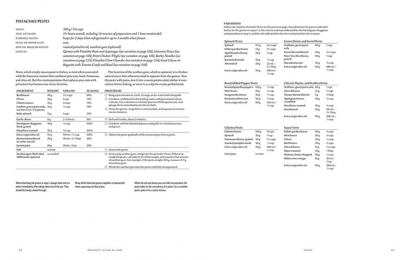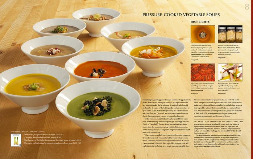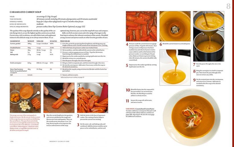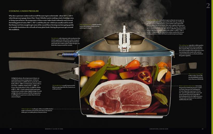 The first 100 pages of the book are a trove of useful information, such as: how to test the accuracy of a thermometer, and why it's time to switch to digital; how to use (and not to use) a blowtorch to sear food fast and beautifully; how to marinate meats more quickly evenly by injecting the brine; the myriad uses for a whipping siphon beyond whipped cream; why those expensive copper pans may not be worth the price; how to deep-fry without a deep fryer; how to stop worrying and get the most out of your pressure cooker; how to cook sous vide at home with improvised equipment, a special-purpose water bath, or a home combi oven.