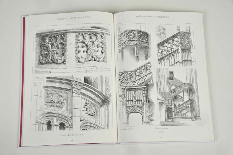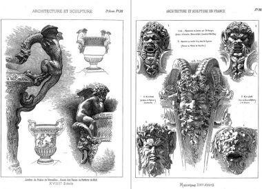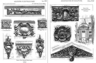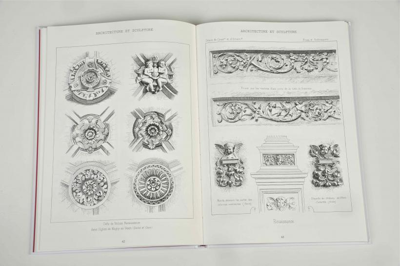 Ce livre présente un grand nombre de motifs sculptés sur pierre utilisés dans l’architecture : chapiteaux, frises, rosaces, cartouches, plafonds, cheminées, etc.