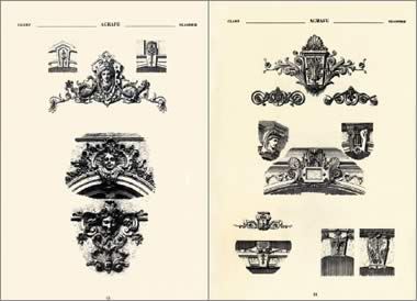 Ce livre sans texte propose plusieurs milliers de gravures représentant des éléments ornementaux d’architecture pour la plupart en pierre, même si le bois, le fer et la calligraphie ne sont pas oubliés. Ces motifs ornementaux sont classés par ordre alphabétique, de Acanthe à Vase. Il peut s’agir de sculptures, de bas-relief, de moulures, de petits ou grands éléments d’architecture civile, militaire ou religieuse, de pièces décoratives et d’ornements divers.