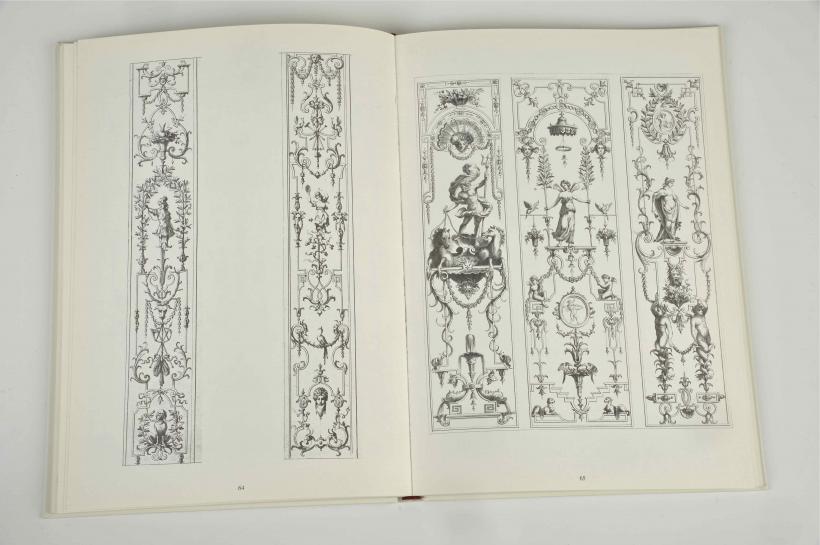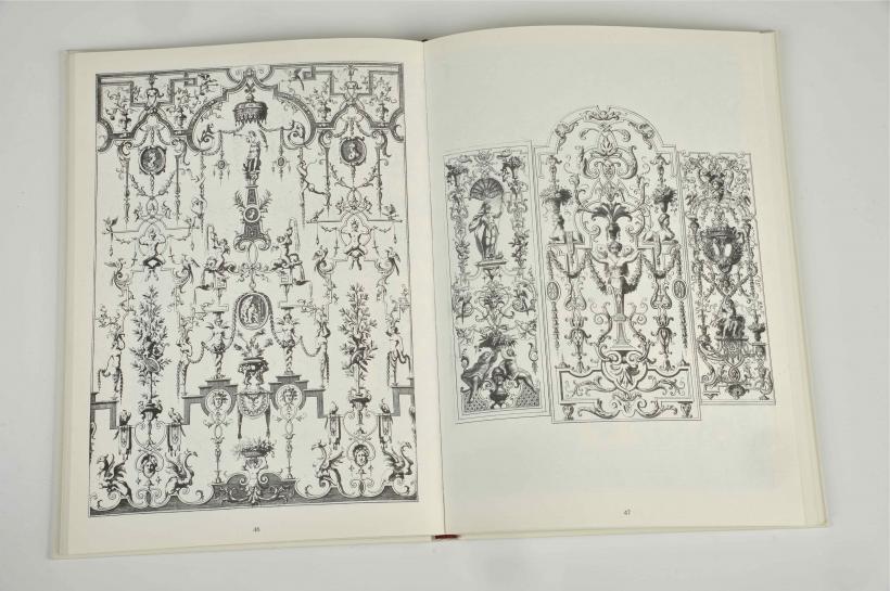 Il fut également un talentueux décorateur d’intérieur, dessinant des lambris et des plafonds, des peintures et des sculptures qui furent utilisés notamment pour la décoration du Louvre et dans les appartements royaux aux Tuileries. C’est principalement ces ornements qui sont reproduits ici dans un fac-similé de 116 planches gravées au XVIIe siècle, sans texte.
