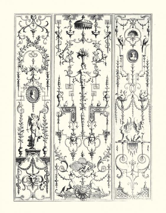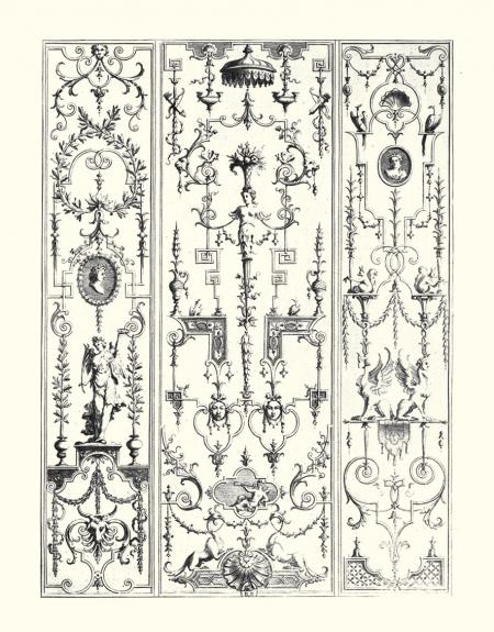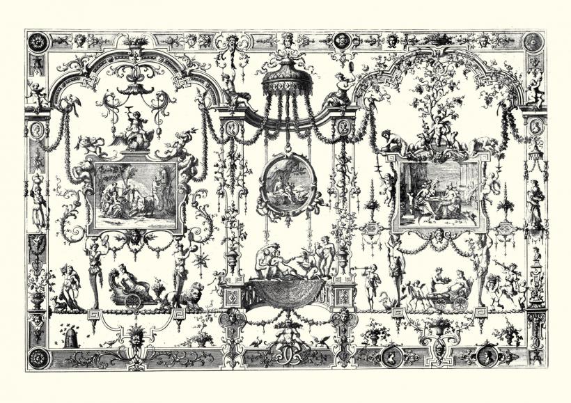 Planches principales de l’œuvre de Jean Bérain, ornemaniste du roi. Ornements de peinture et de sculpture de la galerie d’Apollon au Louvre et du palais des Tuileries