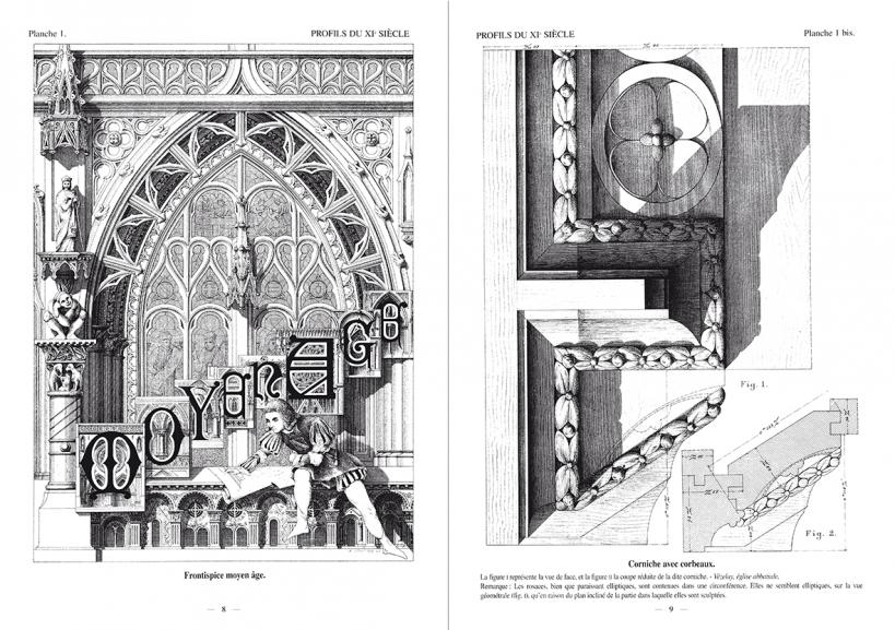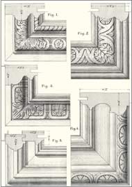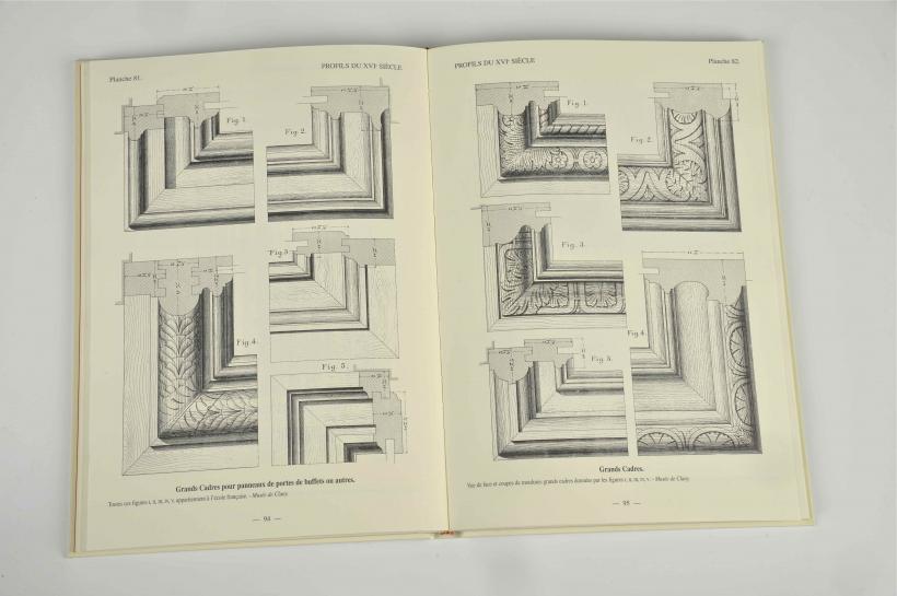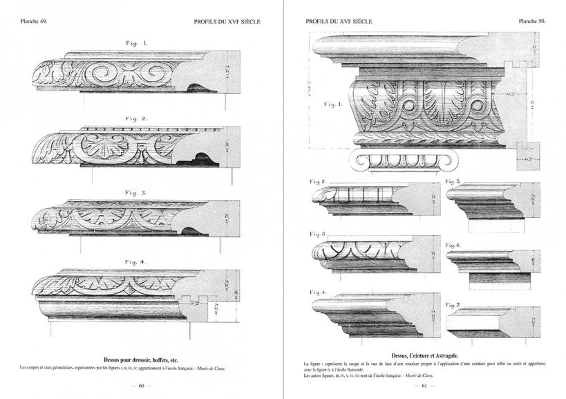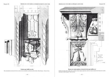 Le propos est articulé par périodes qui suivent les styles de l’histoire de l’art. Chaque chapitre est précédé d’une courte introduction décrivant en quelques mots l’esprit de chaque époque concernant le style et la mouluration. Suivent de superbes planches gravées avec une extrême précision, représentant les moulures, parfois dans leur contexte, vues en élévation et en coupe.