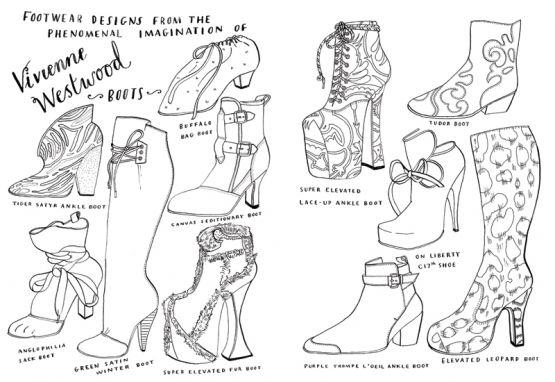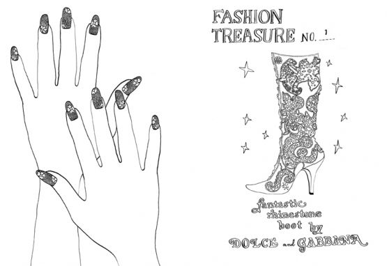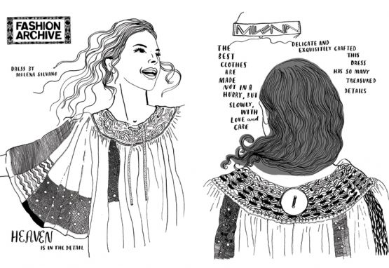 Covering clothing, shoes, bags, jewellery and other accessories, the illustrations span both vintage fashions — drawing on beautiful and interesting objects through the ages — and contemporary invented designs from the illustrator's own imagination.
