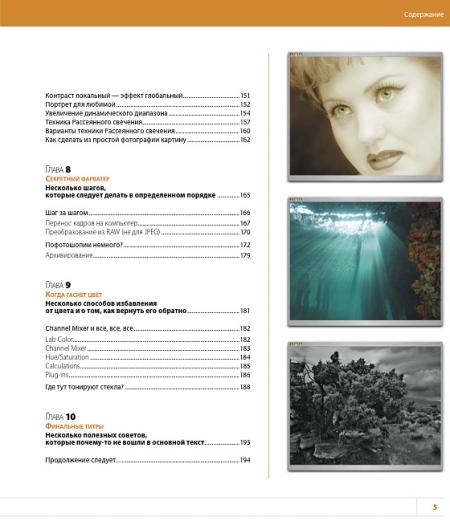 Из книги вы также узнаете, как работать с конвертором Adobe Camera RAW, как создавать Actions, с помощью которых можно оптимизировать обработку цифровых изображений в Photoshop. Вы найдете описание процедур усиления резкости, удаления муара, восстановления динамического диапазона, превращения фотографии в картину и много других полезных и эффектных приемов. И конечно, узнаете, как бороться с неправильной цветопередачей и где можно отпрофилировать свою камеру или принтер. К книге прилагается компакт-диск с исходными изображениями примеров и видеоролики, наглядно демонстрирующие, как происходила обработка этих изображений.