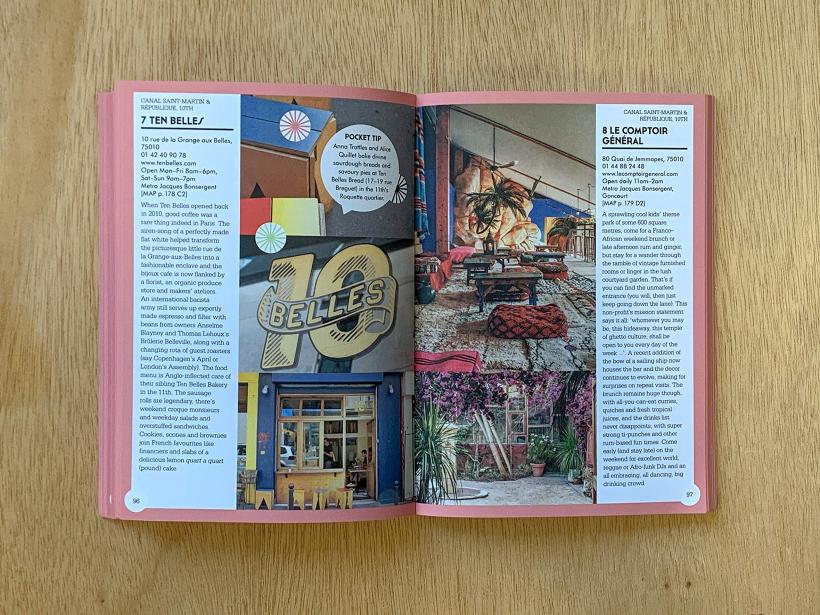 The precincts that the guide covers are: Le Premier, 1st; Sentier, Montorgueil & Bourse, 2nd; The Marais & the Islands, 3rd & 4th; Left Bank, 5th, 6th, 13th & 15th; Eiffel Tower, Champs-Élysées, 7th, 8th & 16th; Pigalle & Opéra, 9th; Canal Saint-Martin & République, 10th; Bastille, Oberkampf & Aligre, 11th & 12th; Montmartre, Château Rouge & Barbés, 18th; Belleville, Ménilmontant & Villette, 19th & 20th.