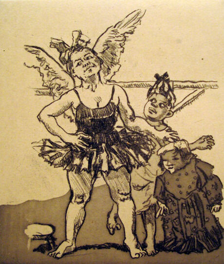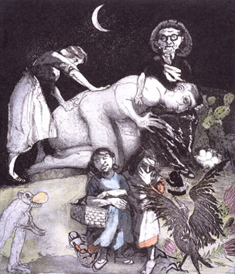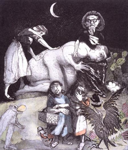 Many of Rego’s prints are based on themes, as she says that one image triggers the idea for the next. Among these are Rego’s Nursery Rhymes, which reveal a darkly humorous take on the difficulties of childhood, and provide a rich seam for her precocious girls and individually characterized animals. Her work is known for revealing complex stories about the sinister side of sexuality and family relations, and Rego’s feminism underlies everything she does: the six works in the Female Genital Mutilation series are some of the most powerful images that she has ever produced