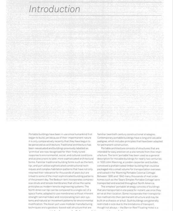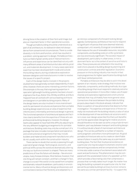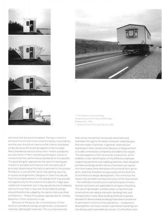 This book discusses the forerunners, present context, and technology of portable architecture. It documents numerous international examples, organized by areas of application, and offers a broad array of suggestions for practical design.