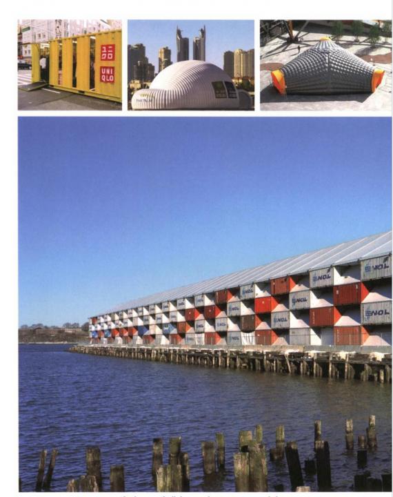 In the Arts and Culture section, Shigeru Ban’s Nomadic Museum, made of shipping containers in the USA and Japan is examined, as is Mark Fisher’s event architecture for concert tours by the Rolling Stones and U2. Suggestions for flexible living include Richard Horden’s micro compact home and the Container Home Kit from LOT/EK.