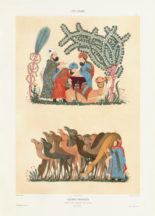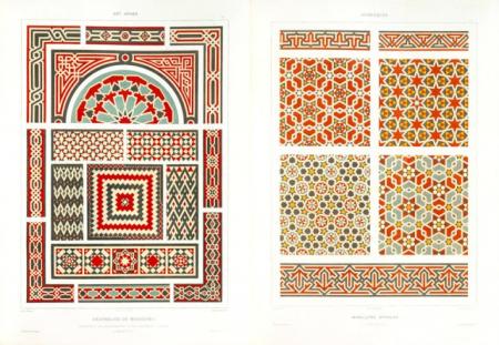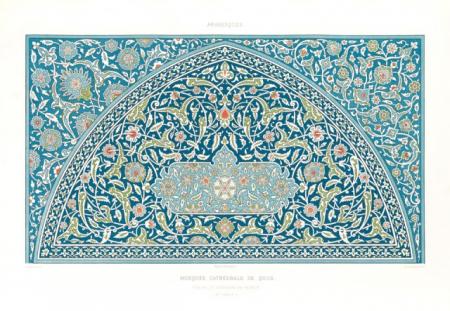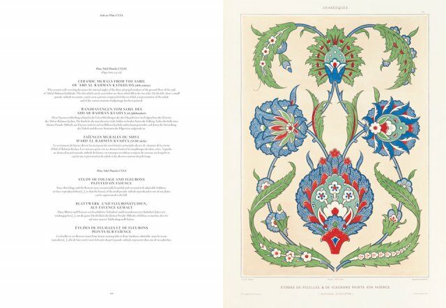 In 1848/1851 Prisse d'Avennes published his Oriental Album in London (Oriental Album. Characters, Costumes, and Modes of Life, the Valley of the Nile). This brilliant collection of 32 chromolithographs illustrating the people and costumes of the Nile Valley was accompanied by a commentary by renowned Orientalist and Egyptologist James Augustus St. John. After again travelling to North Africa, Prisse d'Avennes returned to France in 1860, bearing the fruits of his journeys - hundreds of folio drawings, photographs, sketches, plans and 400 meters of bas-reliefs. Fascinated by the symmetry, complexity, and opulence of Egyptian and Arabic art, he drew from this vast collection to create compilations of the finest examples of art and architecture, which also took into account historical, social, and religious contexts. In 1877, he published his outstanding survey on Islamic art and architecture, Arab Art (L'Art arabe d'après les monuments du Kaire, 1869–1877), in Paris. This publication reproduces the three atlas volumes containing 200 plates - 137 of them magnificent chromolithographs - mainly by Prisse d'Avennes. L’Art arabe is an indispensable compendium on the development of Arabic art, portraying its splendour and diversity, and a work of supreme draftsmanship.