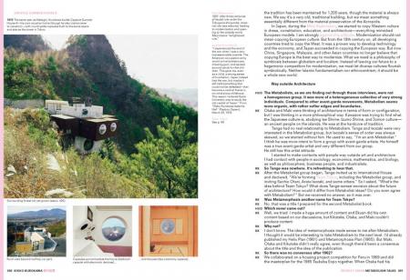 - Extensive interviews with Arata Isozaki, Toshiko Kato, Kiyonori Kikutake, Noboru Kawazoe, Fumihiko Maki, Kisho Kurokawa, Kenji - Ekuan, Atsushi Shimokobe, and Takako and Noritaka Tange