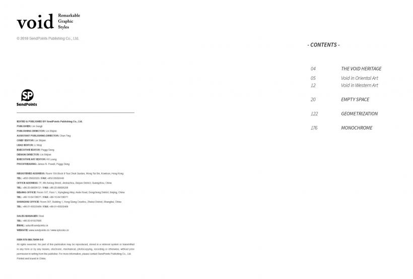 What is Void? It is an oriental aesthetic tradition. Also it is a modern style popular in art and design since the 1960s, namely minimalism. The aesthetics of void helps extract the essentials, maximize functionality, and more importantly, achieve a peaceful harmony. This book will lead readers to explore the distinctive style of “void” in graphic design world, to look closely at its history and development and to discuss its characteristics. The rich coverage of graphic designs of this style by outstanding designers worldwide in this book provide valuable perspectives and inspirations for anyone interested in this unique style.