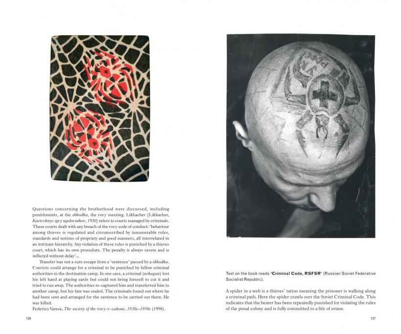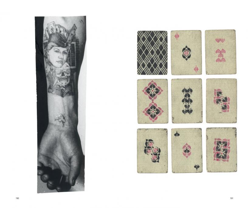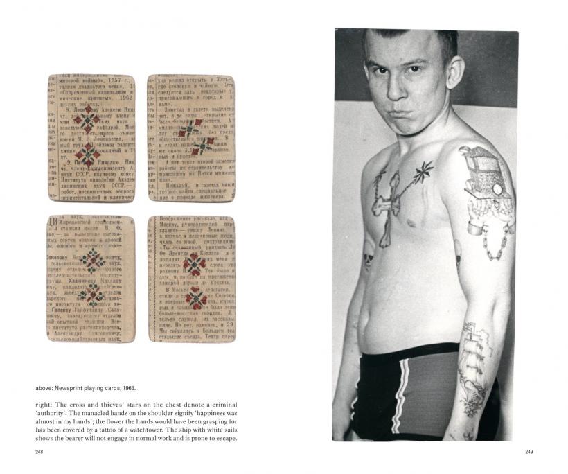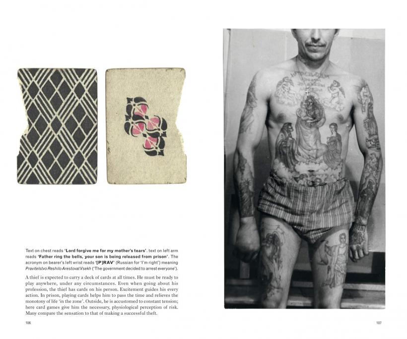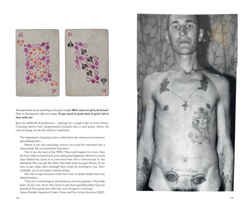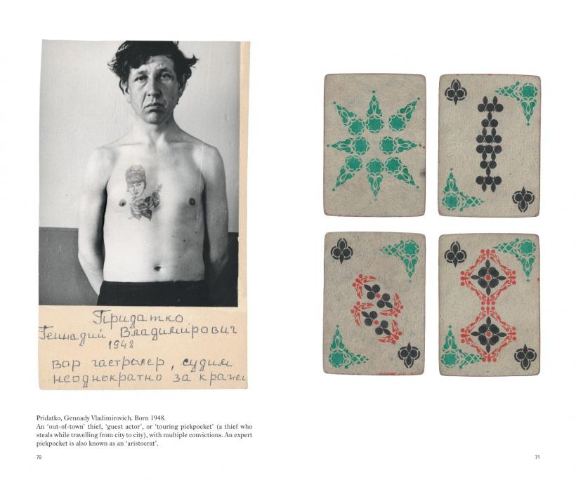 The book also features a further 180 photographs from the Arkady Bronnikov collection. The texts and captions accompanying these images reveal the connection between the criminal hierarchy, tattoos and playing cards. The respect commanded by any criminal was directly related to his ability to play, and win, at cards. The game was viewed as a means to demonstrate cunning and bravado. Failure to pay a gambling debt could result in a forcibly applied pornographic tattoo, lowering their bearer’s status. The loser would also be made to pay the ‘pricker’ (tattooist). Fingers, ears, even eyes, might be lost – cut off in the presence of other prisoners as witnesses.