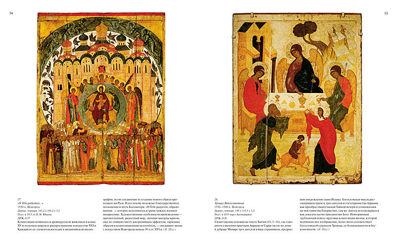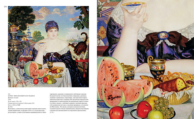 Этот музей, открывшийся для широкой публики в Михайловском дворце Санкт-Петербурга в 1898 г., хранит (наряду с Третьяковской галереей) наиболее полное собрание русской живописи. Альбом отражает все ее разнообразие и предлагает читателю своеобразную экскурсию по залам музея. Древнерусская живопись представлена иконами, в том числе кисти Рублева и Ушакова. Искусство XVIII – первой половины XIX в. оживает в творениях Рокотова, Никитина, Матвеева, Боровиковского, Кипренского, Венецианова, Брюллова, Федотова. Полотна Репина и Сурикова знакомят с творчеством передвижников. Особый интерес сегодня вызывают художники конца XIX – начала ХХ в., в частности Левитан, Серов, Врубель, Коровин, Нестеров, а также мастера «Мира искусства», «Голубой розы», «Бубнового валета». Советское искусство представляют Петров-Водкин, Кончаловский, Филонов, Дейнека, Пластов.