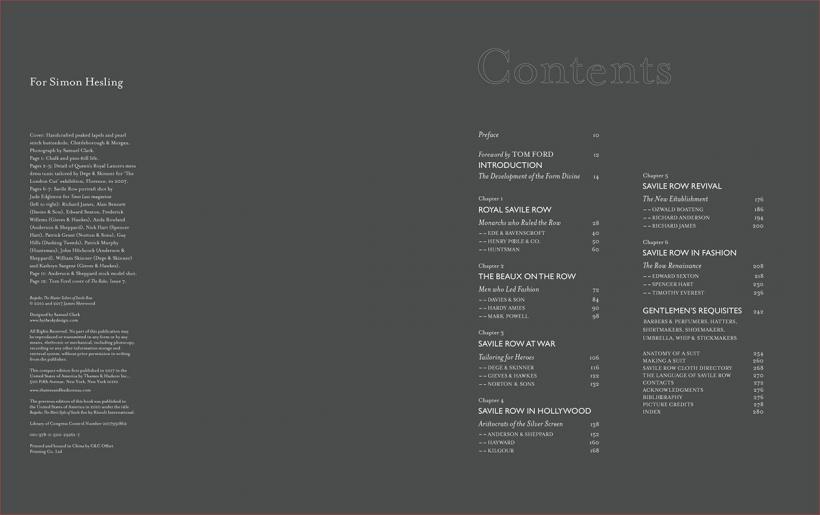 Introduction • 1. Royal Savile Row: Monarchs Who Ruled the Row • 2. The Beaux on the Row: Men Who Led Fashion • 3. Savile Row at War: Tailoring for Heroes • 4. Savile Row in Hollywood: Aristocrats of the Silver Screen • 5. Savile Row Revival: The New Establishment • 6. Savile Row in Fashion: The Row Revival • Gentlemen’s Requisites; Anatomy of a Suit; Making a Suit; The Language of Savile Row