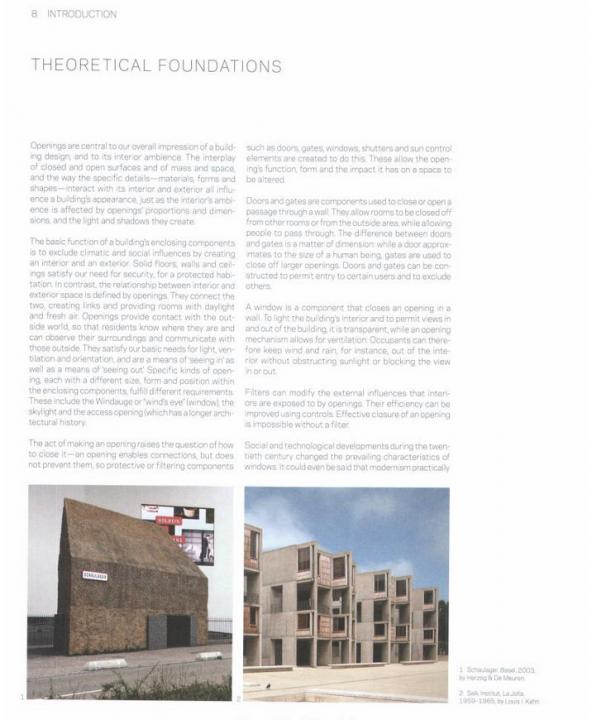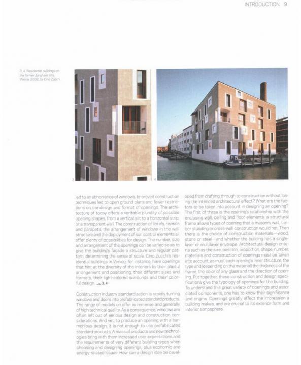 The concept of Open | Close includes not only elements such as windows, doors, gates, loggias and skylights, which communicate between exterior and interior space, but also the structure of the building itself. Because Openings define and determine the relationship of the building to public space, they also determine the character of the site. The analysis of conception, form and construction of opening elements is supplemented and illustrated by international examples of best applications.
