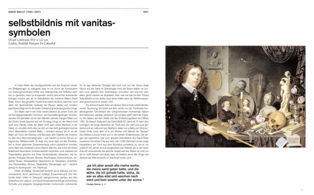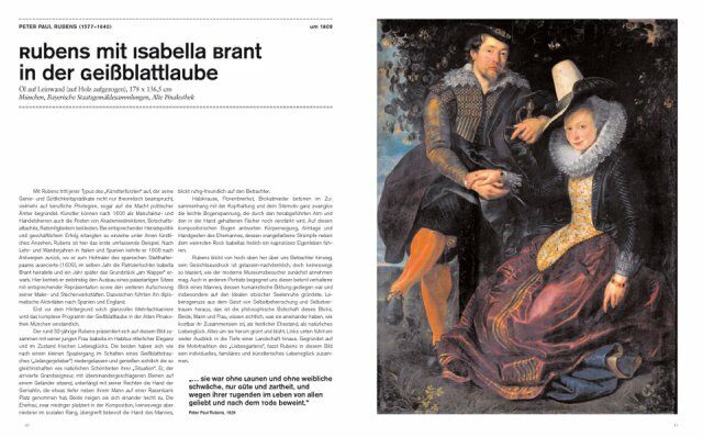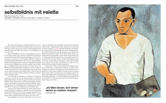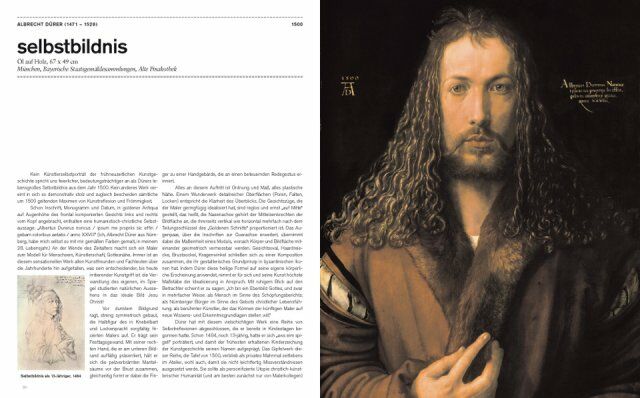 * a selection of the most important works of the epoch; each is presented on a 2-page spread with a full-page image and, on the facing page, a description/interpretation of the work and brief biography of the artist as well as additional information such as a reference work, portrait of the artist, and/or citations