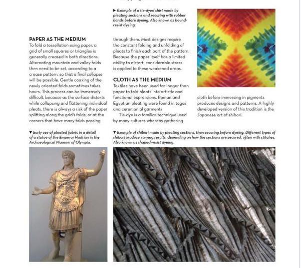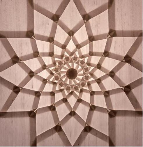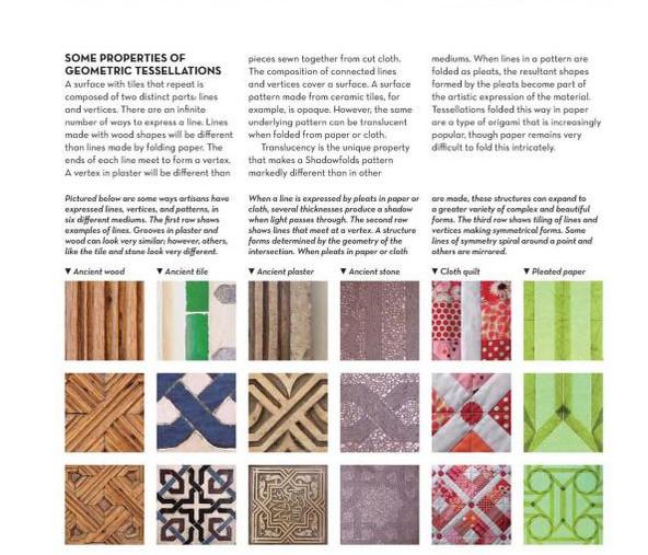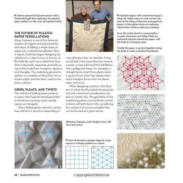 In Shadowfolds, Jeff Rutzky, himself an accomplished and passionate origamist, and Palmer offer detailed and fascinating information about the technique and its origins in both Moorish tile and classic Japanese origami. Palmer first encountered the elaborate mosaics of the Alhambra and became intrigued with learning to translate these patterns into folded paper. He turned for inspiration to the work of Japanese origami masters Tomoko Fuse, Jun Maekawa, Toshikazu Kawasaki and Shuzu Fujimoto, as well as to the great American origami artists Robert Lang and Peter Engel.
