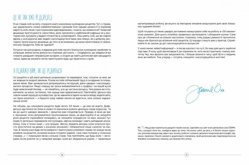 Кожне з 50-ти меню у цій книзі складене так, щоб ви не гаяли ні секунди. Гасло Джеймі Олівера — швидкість і якість! Усі страви в меню ретельно дібрані та протестовані на сумісність, а рецепти розписані так, щоб їх легко було дотримуватися.