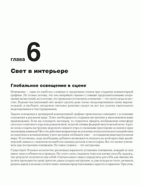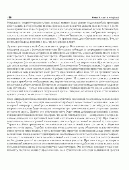 Эта книга научит вас быстро создавать красивые интерьерные сцены и предметы обстановки с помощью программы 3ds Max Design, визуализатора V-Ray и различных подключаемых модулей. Особенность этого издания заключается в том, что автор не перечисляет все безграничные возможности приложения, а дает набор универсальных средств для достижения быстрого и качественного результата. Материал, изложенный в книге, предполагает начальные знания интерфейса и приемов работы с 3ds Max и на примере реальных проектов учит эффективным методам построения интерьерных сцен, их текстурирования и освещения.
