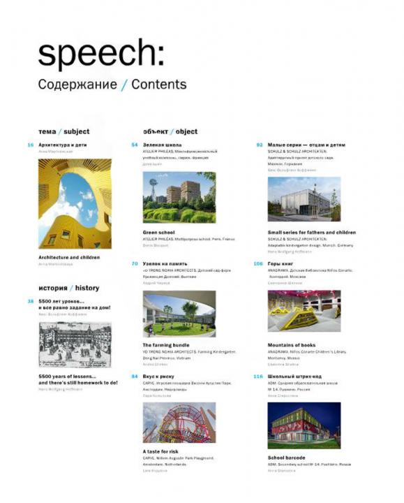 14-й номер журнала speech: посвящен теме «Архитектура для детей» и под своей яркой собрал обложкой более 30 объектов — как для самых маленьких пользователей, так и для среднешкольного возраста.