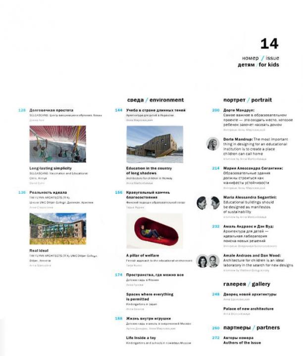 Подрастающее поколение сегодня как никогда раньше находится в центре внимания архитекторов и градостроителей: для апробации тех или иных педагогических методик и систем строятся самые передовые здания, многие из которых опережают свое время. Под обложкой этого номера собраны наиболее яркие постройки для детей более чем 20 стран мира — детские сады и школы, центры внеклассного досуга и игровые площадки, библиотеки, музеи, оздоровительные комплексы. В эпоху, когда инвестиции в человеческий потенциал признаны едва ли не самыми перспективными, типология архитектуры для детей достигла своего поистине максимального разнообразия.