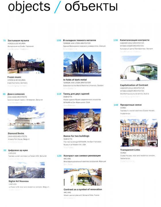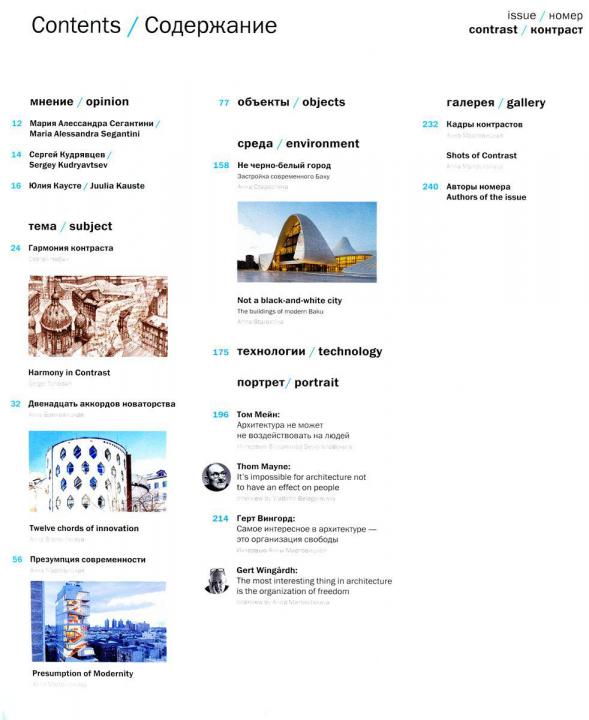 Конечно, контраст в современной архитектуре — явление слишком многогранное для того, чтобы полностью охватить его в одном номере. Но мы постарались сделать наше исследование максимально обширным. Под обложкой этого номера собраны объекты из самых разных стран (от США до Сингапура и Австралии), самых разных масштабов и типологий.