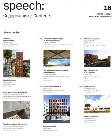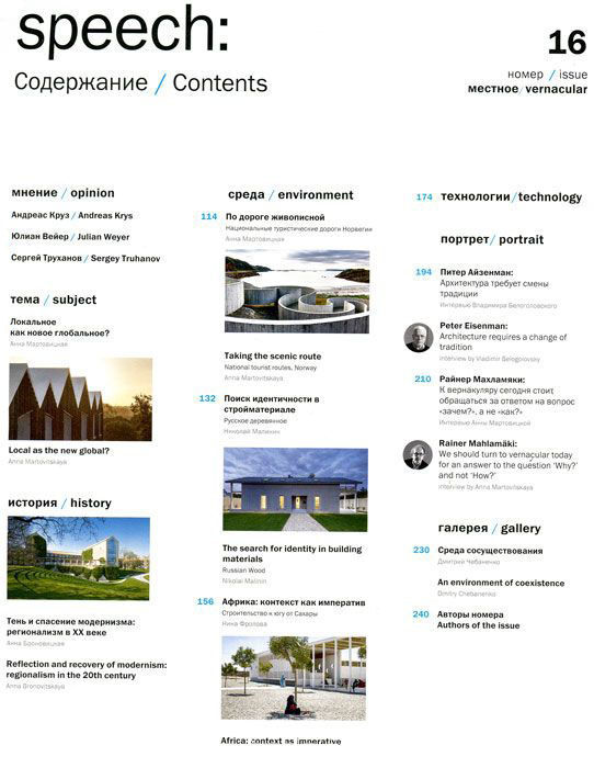 16-й номера журнала speech: посвящен теме «Местное». Под этим определением мы понимаем совокупность сложившихся в том или ином регионе архитектурно-строительных традиций и тех материалов, в которых они воплощались и продолжают воплощаться в реальность.