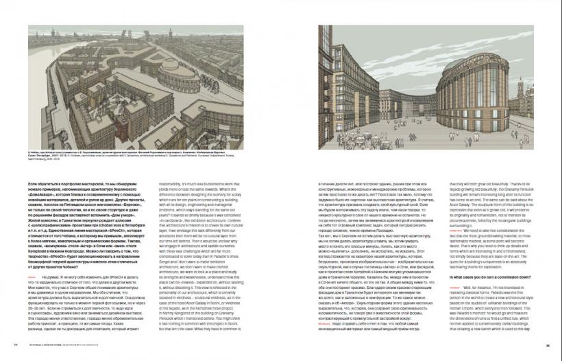 Отдельные (и, к слову, самые обширные) разделы монографии посвящены общественным и торгово-развлекательным центрам, жилым и многофункциональным комплексам. И хотя в книге опубликованы только 3D-изображения и эскизы объектов, именно в этих разделах можно найти здания, которые бюро SPeeCH уже заканчивает возводить в настоящий момент. Одно из них – бизнес-центр на Ленинском проспекте для компании «Новатэк», другое – «Византийский дом» в Гранатном переулке. По словам самих архитекторов, эти проекты стали для молодого бюро своего рода «экзаменом на профессиональную зрелость», возможностью сформировать собственный стандарт работы, свою азбуку, если угодно, собственный архитектурный язык. «В прошлом году у нас был ряд заказов, где можно было сделать стадию «Проект» в масштабе 1:200, как это принято в России, и умыть руки, – вспоминает в интервью Сергей Чобан. – Но я настаивал (и встретил понимание своих коллег), что надо делать иначе: сразу подключать к работе специалистов по фасадам, акустике… То есть разрабатывать здание так, чтобы, спроектировав его в 200-м масштабе, знать, как оно будет выглядеть и в 50-м, и в масштабе 1:1. Это как раз тот профессионализм, которого не хватает в России».