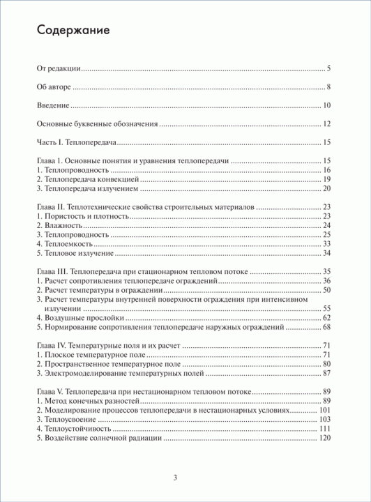 Книга «Строительная теплотехника ограждающих частей зданий» содержит подробное изложение теплотехнических свойств строительных материалов, теплопередачи при стационарном тепловом потоке, расчета плоских и пространственных температурных полей, воздухопроницания ограждений, особенностей теплотехнического режима отдельных частей наружных ограждений, влажностного режима ограждений при увлажнении их жидкой и парообразной влагой.
