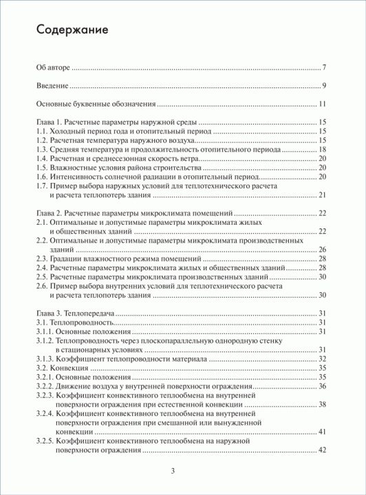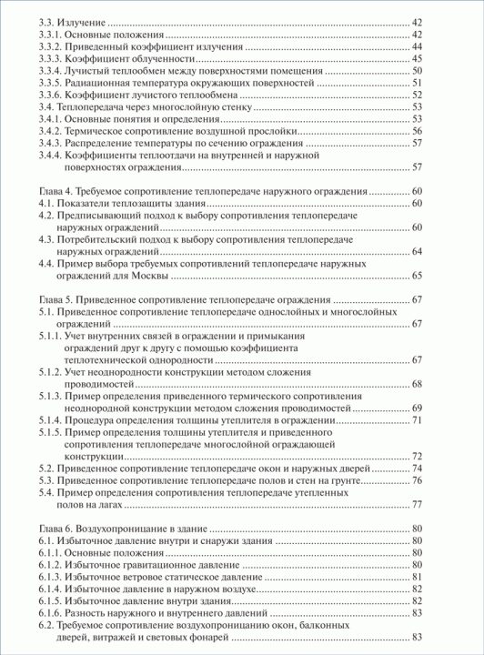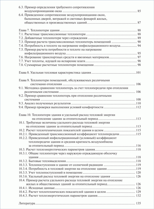 Отдельные разделы посвящены выбору расчетных параметров наружной среды и микроклимата здания, основам теплопередачи в ограждениях здания, нормам выбора расчетных значений коэффициентов теплопроводности строительных материалов и коэффициентов теплообмена на поверхностях ограждений, определению требуемого сопротивления теплопередаче ограждений, расчету трансмиссионных теплопотерь здания и потребности в теплоте на нагревание инфильтрационного воздуха, сравнению теплопотерь здания при различных типах системы отопления.