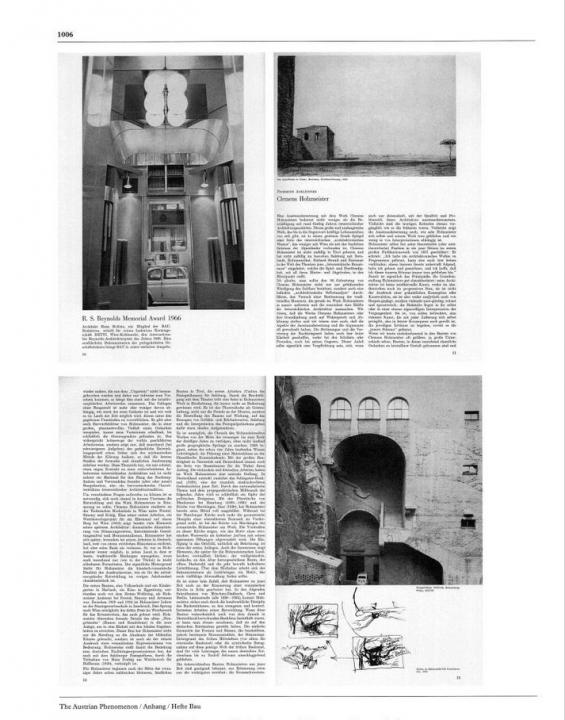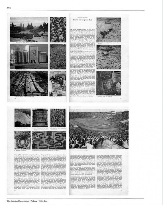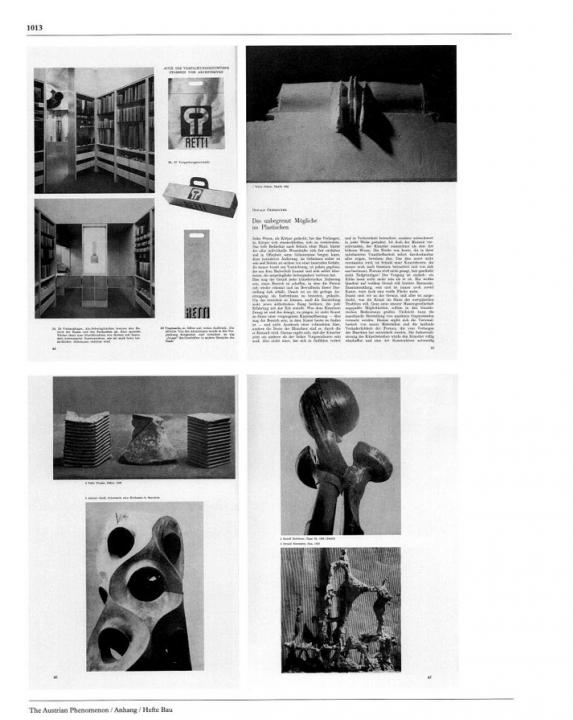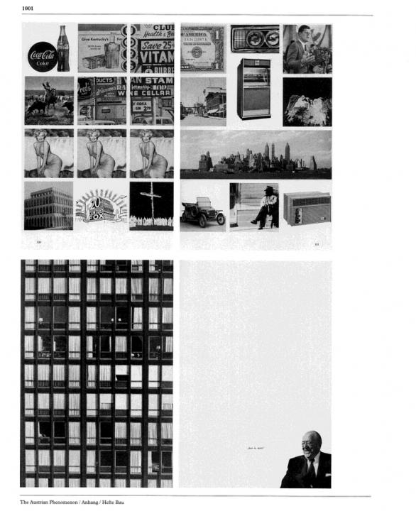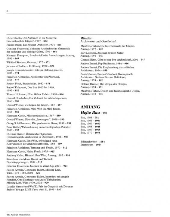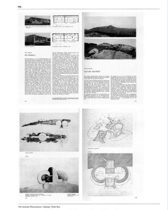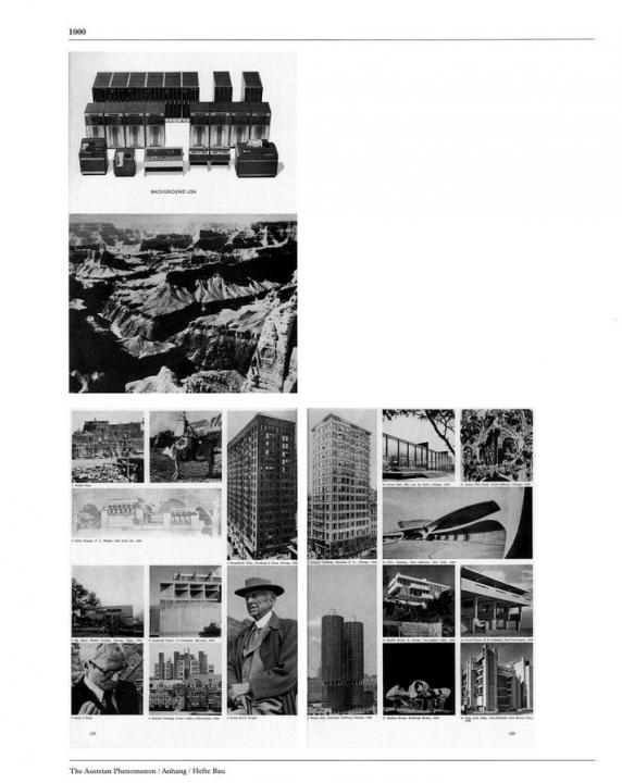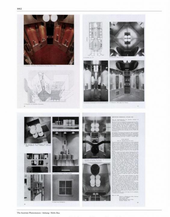 The second is "Reconstruction," a cross-section of images and texts from publications on the "Austrian phenomenon," elucidated and situated in the context of international architectural history by authors such as Friedrich Achleitner, Bart Lootsma, Stanislaus von Moos, Joseph Rykwert, Anthony Vidler, and others.
