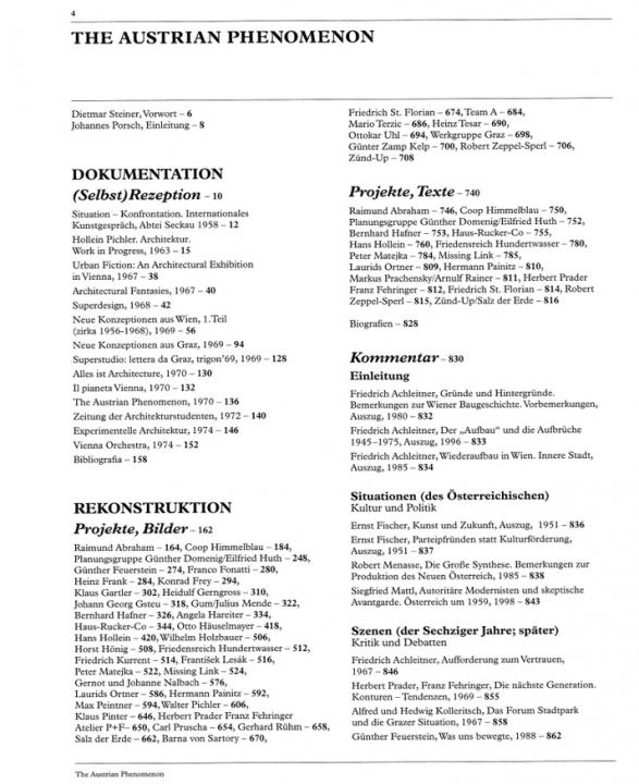 Das durchgehend farbig illustrierte Buch besteht aus zwei Teilen: Der „Dokumentation" wesentlicher Publikationen aus den Jahren 1958–1973 in internationalen Fachzeitschriften wie Archigram, Domus, Architectural Record, Casabella, in denen die jungen Architekten ihren Programmen internationale Aufmerksamkeit verschafften. Sowie der „Rekonstruktion", einem Querschnitt von Bildern und Texten aus Publikationen, die sich dem dem "Austrian Phenomenon" widmeten und von Autoren wie Friedrich Achleitner, Bart Lootsma, Stanislaus von Moos, Joseph Rykwert, Anthony Vidler u.a. erläutert und im architekturhistorischen internationalen Kontext verortet werden.