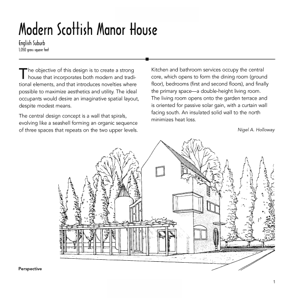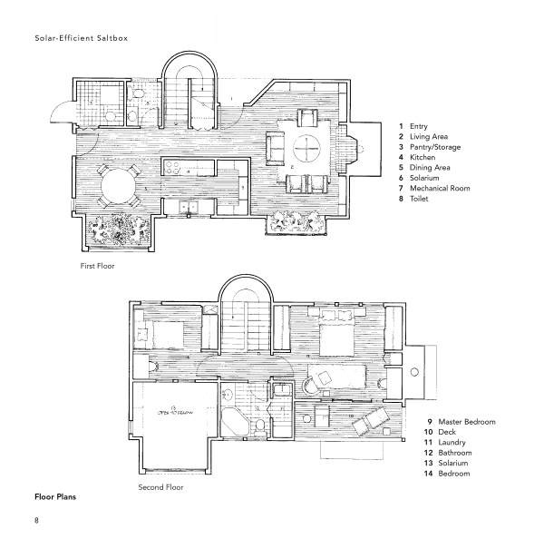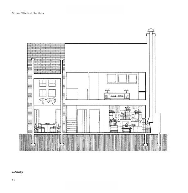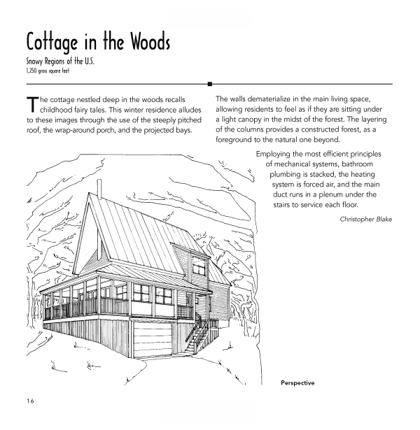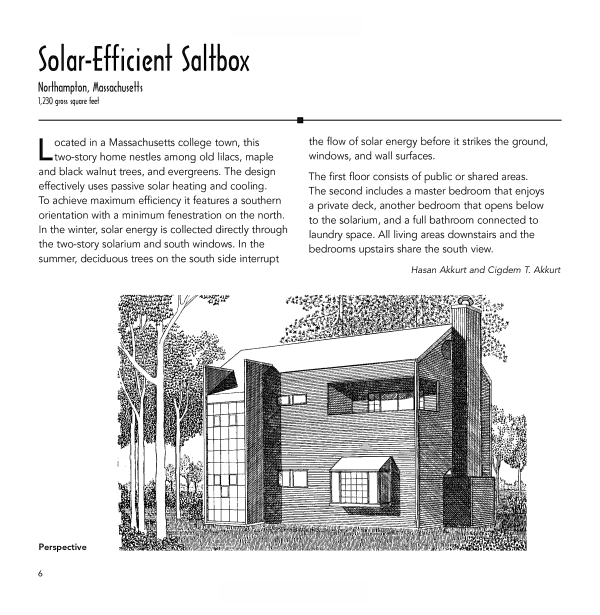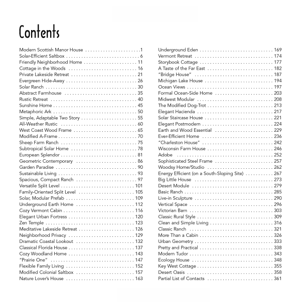 The designs include site drawings, floor plans, elevation drawings, section drawings, perspective drawings, and exploded views. A brief introduction to each home describes its setting, the philosophy behind the design and its intended use, materials used, recommended landscaping, and more. Many of the homes come with money-saving and environmentally sound features such as solar panels and water heaters, wood stoves, ceiling fans, airlock entries, wind power alternatives, and natural gas heaters.