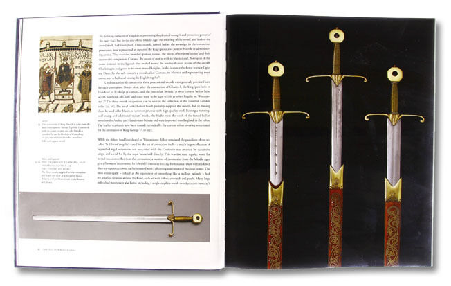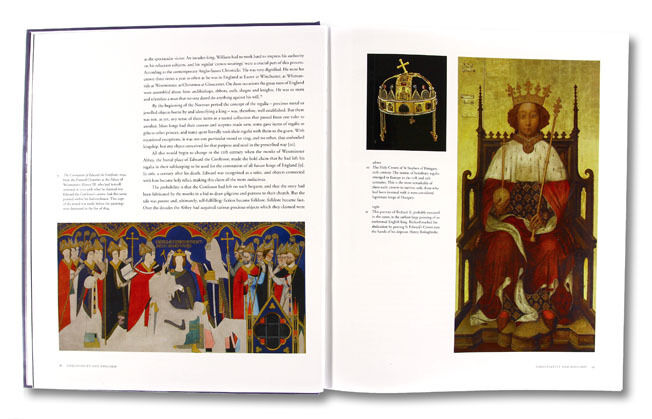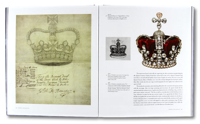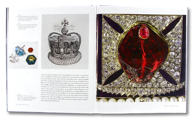 The text, recounts the development of the collection in the medieval period, the dramatic sale and melting down of almost every piece after the execution of Charles I in 1649 and the remaking of the Crown Jewels for Charles II in 1660. Since then the collection has been augmented with pieces that reflect key moments in English history, such as the regalia created for the only joint monarchs, William III and Mary II, in 1689, and the crown made for King George V’s inauguration as Emperor of India in 1911.