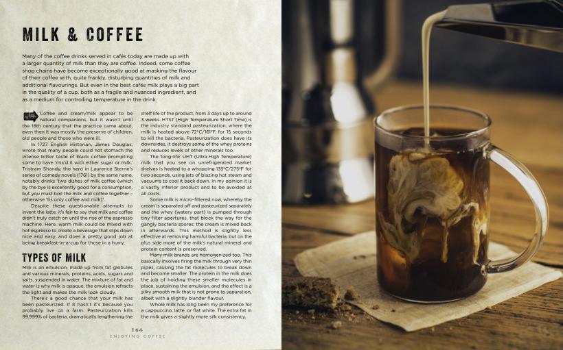 You’ll then get to grips with grinding before learning about the history of the espresso machine and how to make the perfect espresso in the Espresso chapter. Discover how espresso and milk are a match made in heaven, yielding such treasures as the Latte, Cappuccino, Flat white and Macchiato; you’ll also find out how to pour your own Latte art.