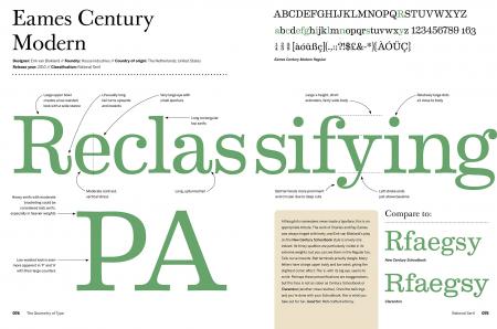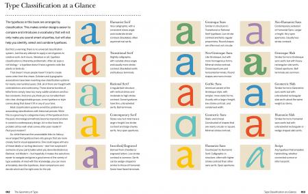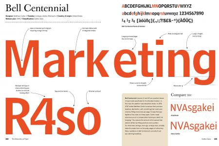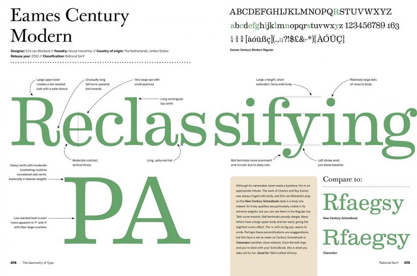 Characters from each typeface are enlarged and annotated to reveal key features, anatomical details, and the finer, often-overlooked elements of type design, which shows how these attributes affect mood and readability. Sidebar information lists the designer and foundry, the year of release and the different weights and styles available, while feature boxes explain the origins and best uses for each typeface, such as whether it is suitable for running text or as a display font for headlines. To help the reader spot each typeface in the wider world, the full character set is shown, and the best letters for identification are highlighted.