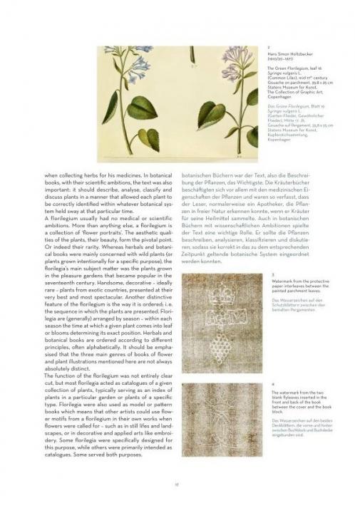 Das Florilegium stammt aus dem 17. Jahrhundert und umfasst 178 Tafeln mit ca. 400 botanischen Motiven, die in Lebensgröße und mit außerordentlicher Präzision gemalt wurden. Die künstlerisch erstklassigen Gouachen auf Pergament zeigen blühende Pflanzen im Jahreslauf, darunter botanisch exakte Abbildungen von Rosen, Tulpen, Narzissen und Lilien. Weder signiert, noch datiert, wird es Hans Simon Holtzbecker (1649–1671) zugeschrieben, einem der bedeutendsten Blumenmaler, der auch den berühmten Gottorfer Codex geschaffen hat. Das Florilegium befindet sich im Besitz des Statens Museum for Kunst in Kopenhagen, wo es über mehrere Jahre hinweg aufwendig restauriert wurde und jetzt endlich wieder in vollem Glanz erstrahlt.