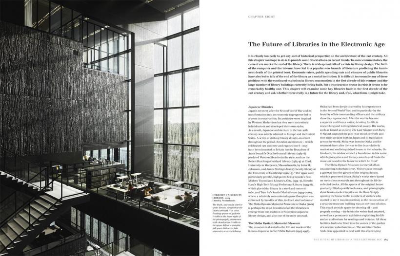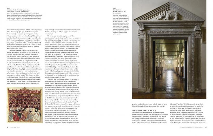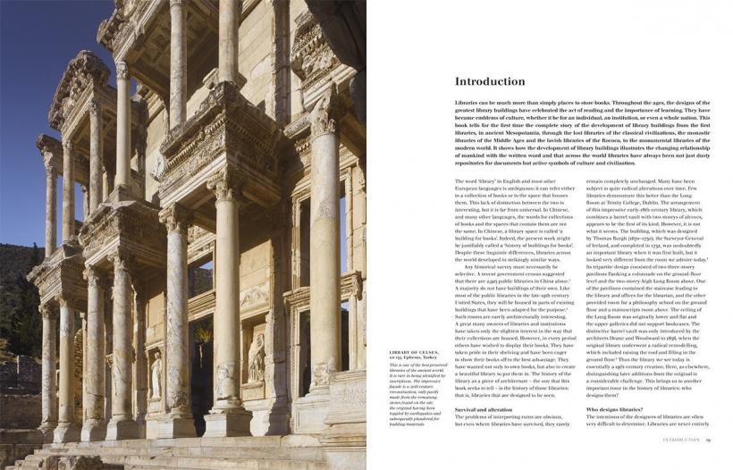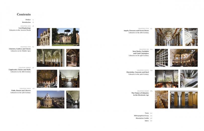 Preface; Introduction • 1. Lost Beginnings – Libraries in the Ancient World • 2. Cloisters, Codices and Chests – Libraries in the Middle Ages• 3. Cupboards, Chains and Stalls – Libraries in the Sixteenth Century • 4. Walls, Domes and Alcoves – Libraries in the Seventeenth Century • 5. Angels, Frescoes and Secret Doors – Libraries in the Eighteenth Century • 6. Iron Stacks, Gas Lights and Card Catalogues – Libraries in the Nineteenth Century • 7. Electricity, Concrete and Steel – Libraries in the Twentieth Century • 8. The Future of Libraries in the Electronic Age