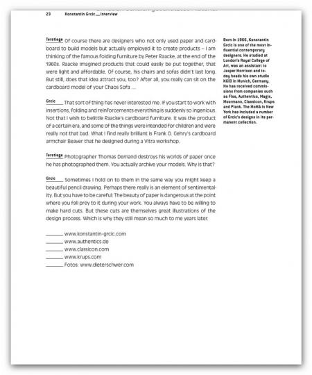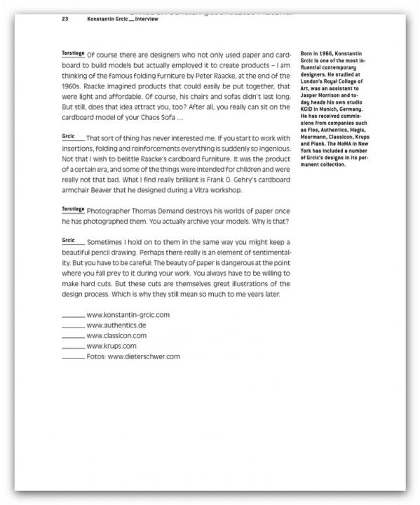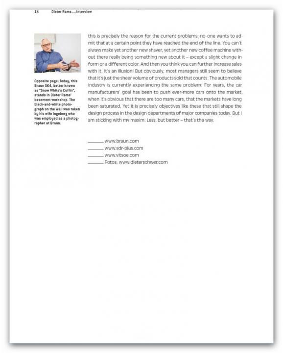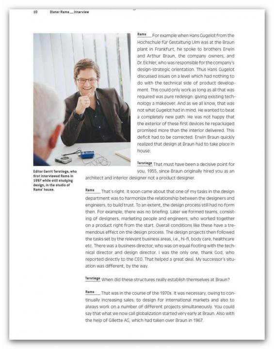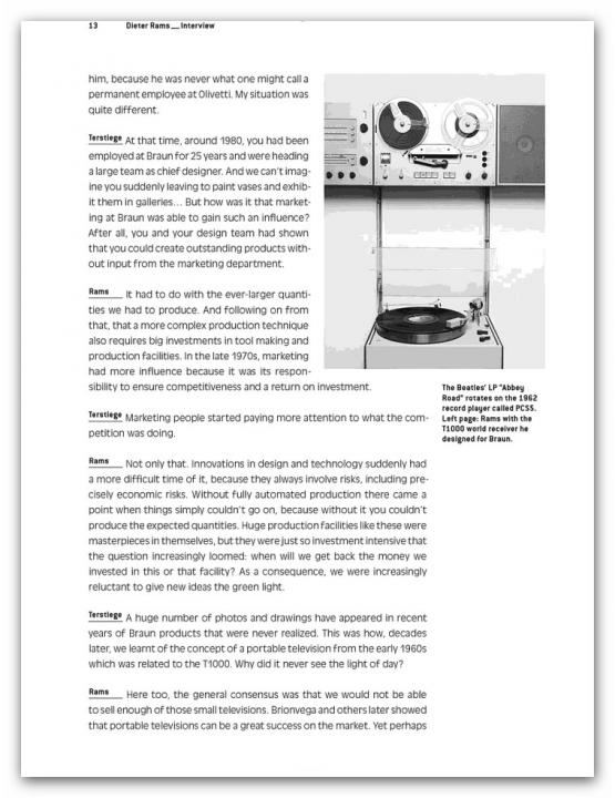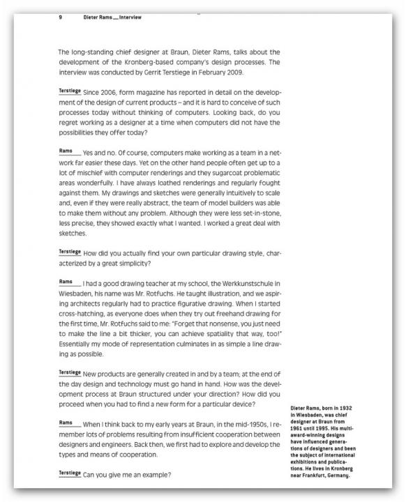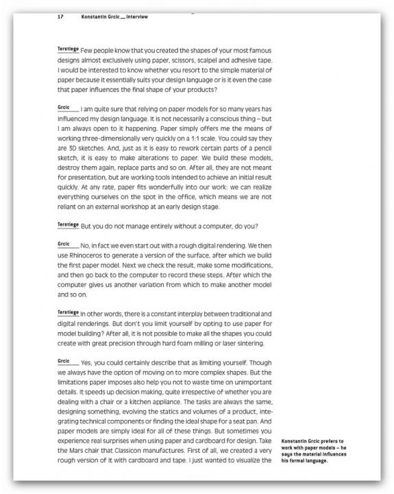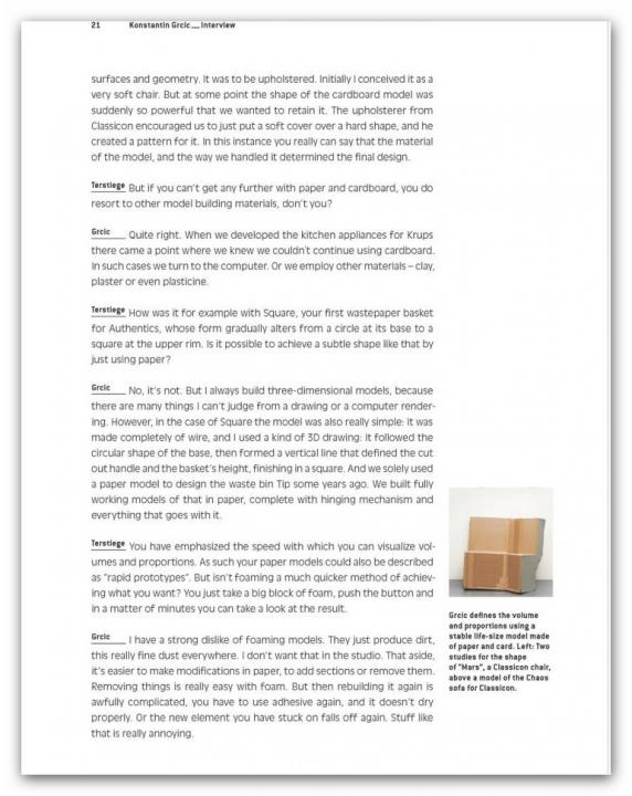 Renowned designers like Konstantin Grcic, the Bouroullecs, Stefan Diez, Hella Jongerius, and Sir Norman Foster offer step by step accounts of how they go about designing products for Vitra, Grundig, Jura, and Authentics – the tools they use for visualization and how projects change during the model phase. Plus: an interview with design legend Dieter Rams on realized and unrealized products for Braun.