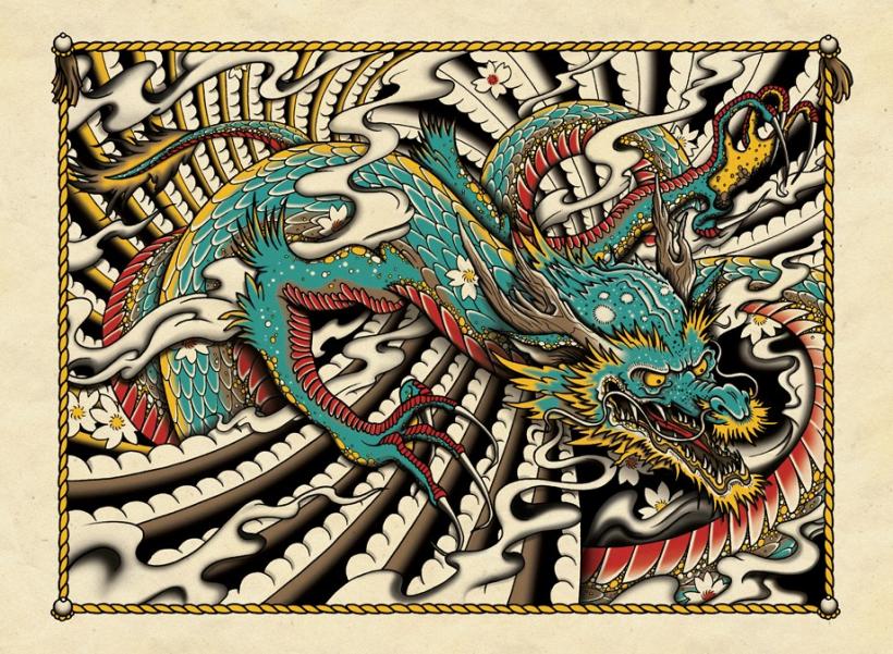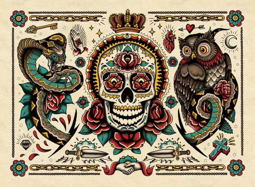 Somewhere in between the salted cracks of Brighton’s underbelly lives an elusive yet prolific mark-maker who goes by the moniker of MEGAMUNDEN. He leaves a trail of work on walls, billboards, magazines, figurines, products, paper and skin. From crafting for corporate giants to meticulous tattoo designs for private clients, ceiling murals in affluent New York apartments to local shop frontages – another surface is just another canvas. Vintage skate art, psychedelia, nature and an essence of the Far East are all combined to create his signature melting-pot style but nothing is more evident than tattoo art and culture, an area that Megamunden has explored extensively, leading to commissions from around the world and ultimately to the creation of this book.
