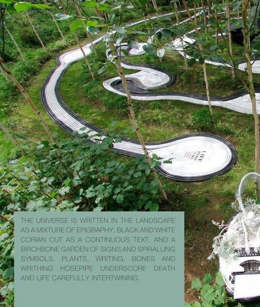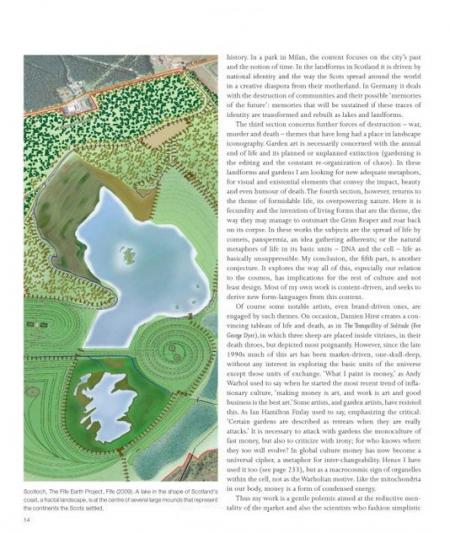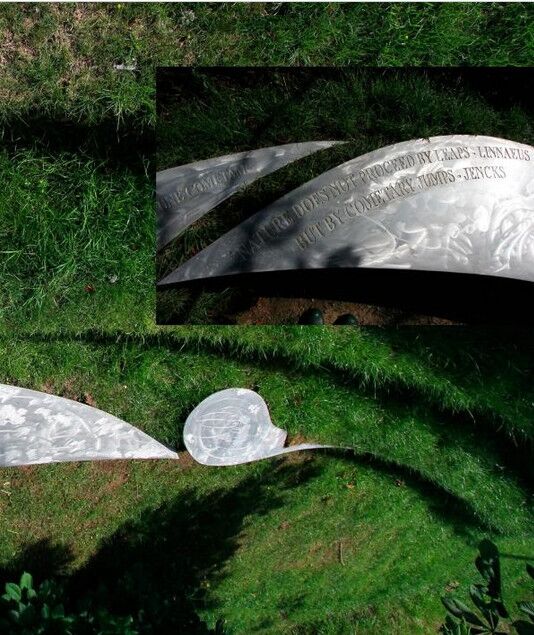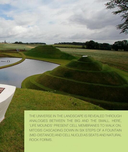 Other designs include sharp comments on recent events: a water garden of war in France critiques the 2003 invasion of Iraq using 'waterpults' and 'hose-guns' among other interactive features; a white garden made from birch trees, flying bones and computer graphics deals with some fatal consequences of modernity. Jencks addresses, with wit and irony, some of the strange possibilities that arise with extra-large landforms. Northumberlandia, perhaps the largest human figure ever made, presents the question of which body parts one can walk on safely, which are dangerous and which need to be suppressed. What became perhaps the heaviest work of art in the world, at 20 million tons, was also the opportunity to transform a large open-cast mine into a dynamic landscape of giant mounds and sculpted lakes.