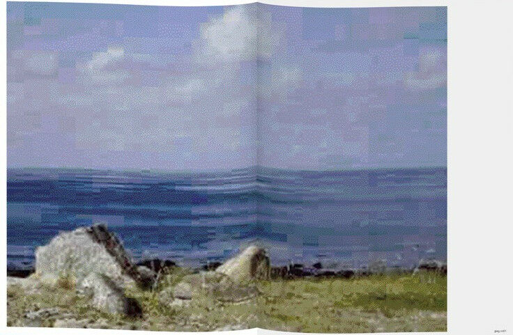 In 2007, Ruff completed his monumental Jpegs series in which he explores the distribution and reception of images in the digital age. Starting with images he culls primarily from the Web, Ruff enlarges them to a gigantic scale, which exaggerates the pixel patterns until they become sublime geometric displays of color. Many of Ruff's works in the series focus on idyllic, seemingly untouched landscapes, and conversely, scenes of war, and nature disturbed by human manipulation.