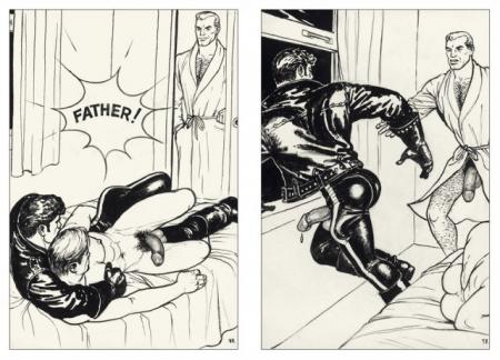 In 1965, Tom of Finland began flirting with the idea of an ongoing character for his panel stories, the ultimate Tom's Man. He tried out a blond named Vicky — a common male name in Finland — followed by a Tarzan-inspired Jack. Then in 1968, Tom settled on Kake, a dark-haired, moustached leatherman who often wore a tight white t-shirt bearing the motto “Fucker.” Kake lived up to this moniker, a sort of post-Stonewall, hyper-masculine Johnny Appleseed travelling the world on his motorcycle to spread the seeds of liberated, mutually satisfying, ecstatically explicit gay sex. Tom lived out many of his most personal fantasies through Kake, and Kake’s international fans made him the template for what came to be known as the gay clone look of the 1970s.