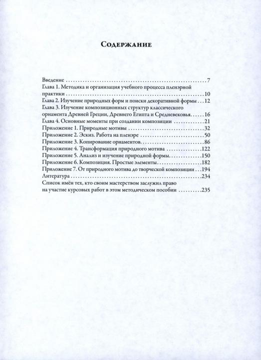 Материал методического пособия изложен в той последовательности, в которой изучается курс композиции. Текст сопровождается богатым иллюстративным материалом: фото натуральных природных форм, пленэрных зарисовок, эскизов, трансформированного природного мотива в виде общих конструктивных схем, линейных форм и силуэтов.