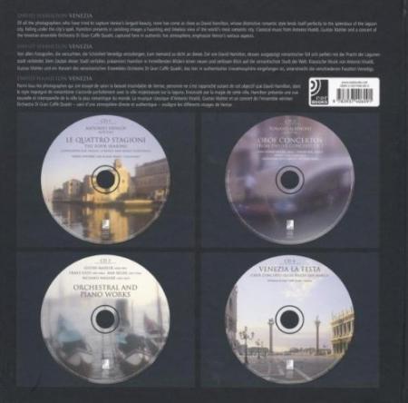 This is a collection of a book and 4 CDs. Venezia is one of the most beautiful cities in the world. Cult photographer David Hamilton takes a characteristically romantic view of the lagoon city and reveals a quite different side to his artistic creativity. Classical music highlights Venezia's various aspects with works by composers from Antonio Vivaldi to Gustav Mahler and the Venetian ensemble Orchestra Di Gran Caffe Quadri, captured here in authentic live atmosphere.