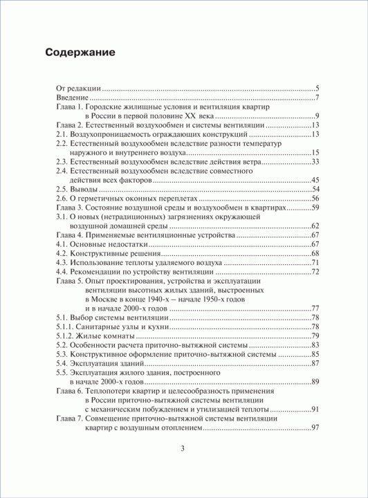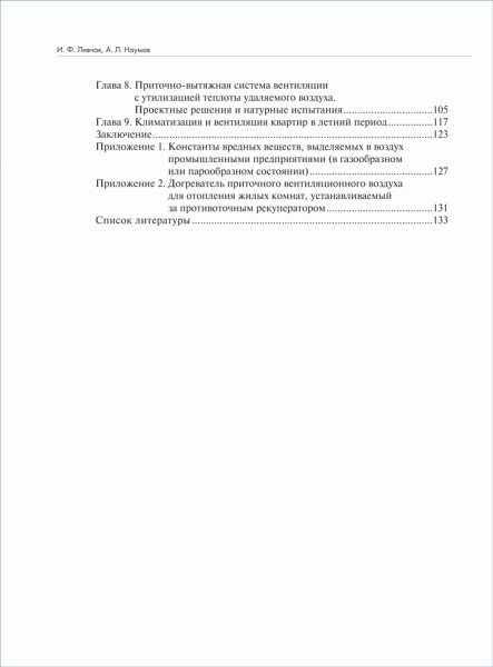 Приводятся рекомендации о необходимом воздухообмене в квартире с учетом разнообразия выделяющихся вредных веществ. Дается описание применяемых вентиляционных устройств, в том числе в московских высотных зданиях, построенных в 1940-1950-х годах, их недостатки и пути совершенствования. Показана целесообразность применения приточно-вытяжной вентиляции с механическим побуждением, позволяющей использовать тепло удаляемого из здания вентиляционного воздуха и обеспечивающей экономию энергии. Даны решения по улучшению состояния приточного воздуха, подаваемого в квартиры и имеющего повышенные загрязнения приземной городской атмосферы. Учитывая преимущества и имеющийся положительный опыт длительной эксплуатации в экспериментальных зданиях приточной вентиляции, совмещенной с воздушным отоплением, в монографии приведены необходимые сведения о применении этих систем. Отдельно освещается вопрос климатизации и вентиляции квартир в летний период.