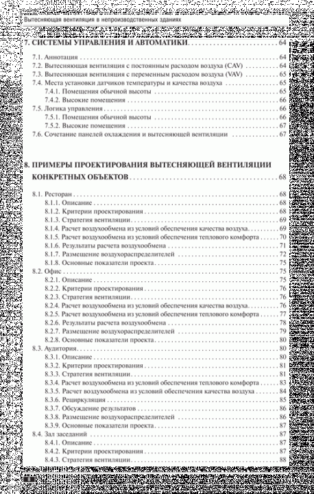 В книге «Вытесняющая вентиляция в непроизводственных зданиях» приведены общие сведения о физической картине распространения воздушных и тепловых потоков в помещениях с вытесняющей вентиляцией, о конвективных потоках, формирующихся над источниками тепловыделений, воздухораспределителях, применяемых для подачи воздуха в помещения с вытесняющей вентиляцией. Рассмотрены вопросы стратификации температуры воздуха и концентраций вредных выделений по высоте помещений, распределения скорости воздуха в обслуживаемой зоне. Приведены примеры проектирования систем вытесняющей вентиляции для ряда непроизводственных помещений: обеденного зала ресторана, офиса, учебной аудитории, зала заседаний, класса.